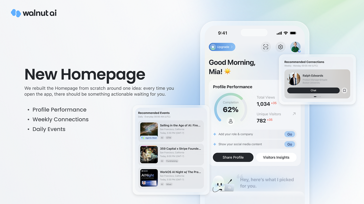 Here’s something that’s been on my mind: most apps greet you with a feed. Scroll, scroll, scroll. But for a professional networking tool, that felt wrong. When you open Walnut AI, I want you to feel like someone already did the homework — figured out who you should meet, what events matter, and what’s holding your profile back.