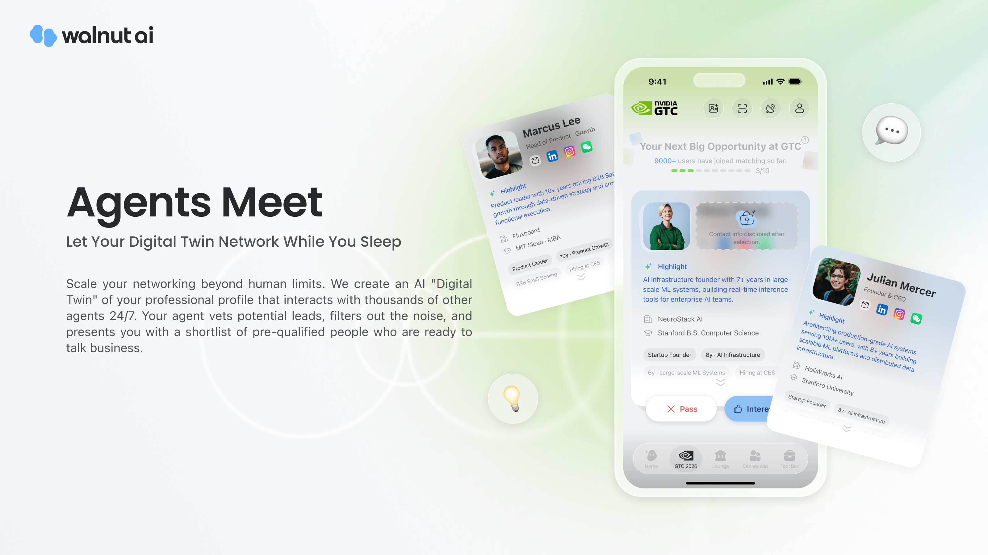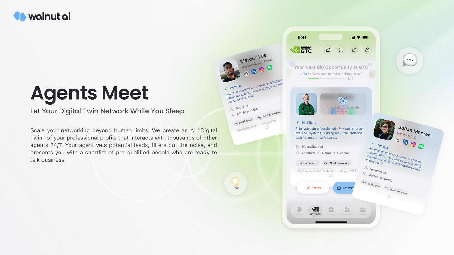 If you tried our Agents Meet at CES, you know the drill — your AI Digital Twin pre-screens thousands of attendees and matches you with the most relevant people before you even arrive. We’re bringing that same playbook to NVIDIA GTC.